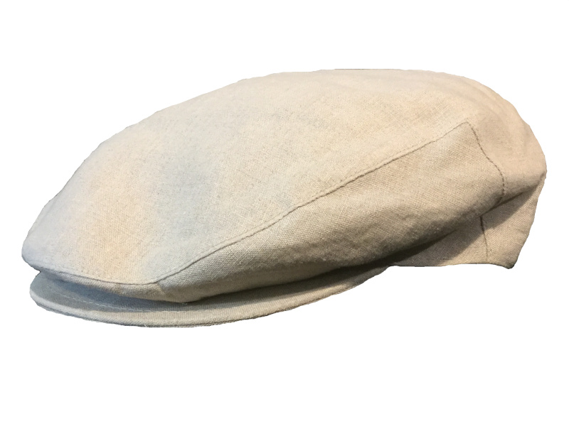 100% linen.  Made in Italy.  Sizes: S - 2XL.  Color: Light tan.  Classic driving cap style, lined, double snapped on bill.