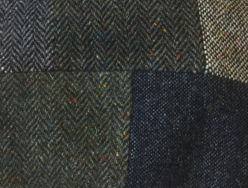 100% wool. Made in Ireland by John Hanley. Sizes: S - XL. Tweed color: assorted patchwork. A slightly trimmer, one-piece style.